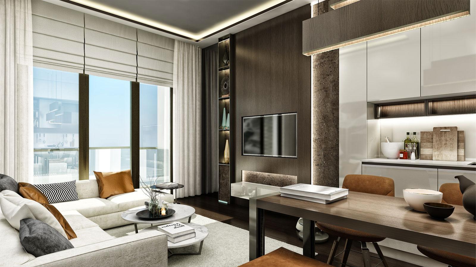 The vernacular style of Selchuk and mostly Ottoman Architecture where the geometric schemes in masterplan, facades and key areas of the buildings, the marble facades and floors with nostalgic Anatolian and Mediterranean details including canopies, eaves and bay windows represents the overall design approach of Piyalepaşa Istanbul Mixed-use Project. The same way reflected into interior design with modernised interpretations of furniture, lightening and use of space, which is a broad work and conceptual story, due to that show home selection is limited only with 3+1 and 1+1 units. Light and dark colour selections enriched the design, timber furniture and marble with bronze details and clear cut lines with lighting are major features of design thinking in Piyalepaşa İstanbul interiors.